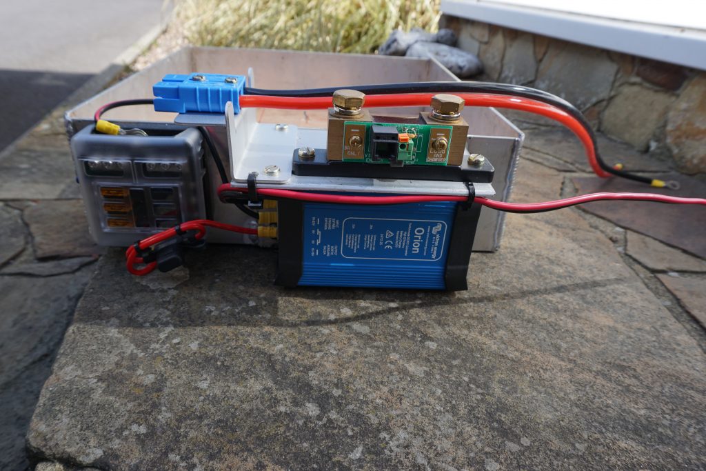 The first addition to the two fixed batteries was a fuse, I use cube fuses that allow the protection to start at the battery terminal, the small busbar carries two cube fuses, a 100 amp for the inverter and a second 40 amp for the remaining circuits to be powered by the battery bank.
